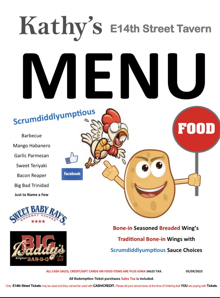 Welcome to 14th Street Tavern, a delightful culinary gem nestled in Des Moines. The menu here boasts a harmonious blend of comfort food that perfectly accompanies the vibrant bar atmosphere. Start your visit with Kathy's Award Winning Chili or the seasonal Jana's Homemade Stew, both crafted to warm your heart. For those craving something crispy, the East 14th Street Taco Salad served in a freshly made tortilla bowl is a must-try.